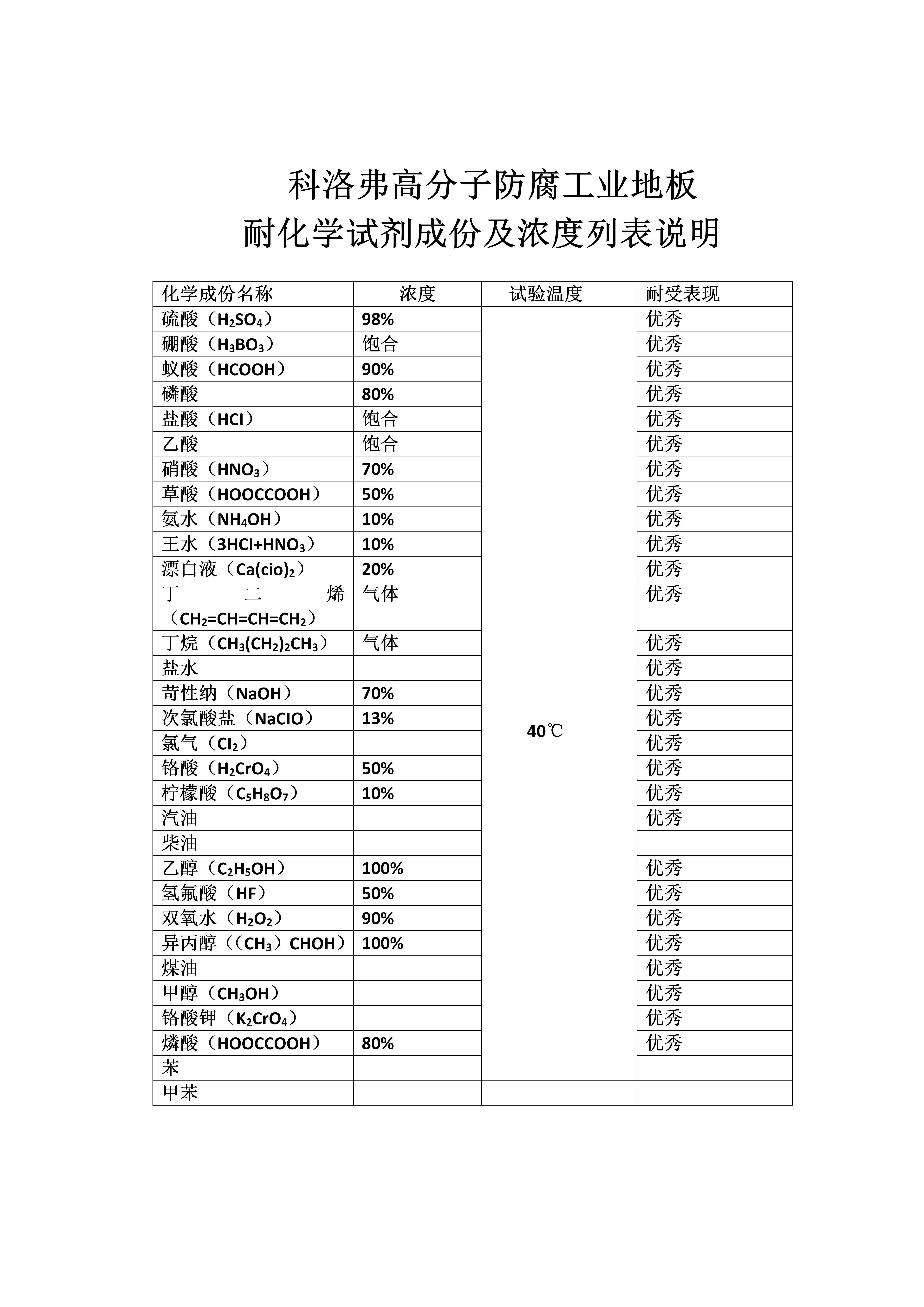 科洛弗高分子防腐工業(yè)地板可耐受的各種化學試劑
