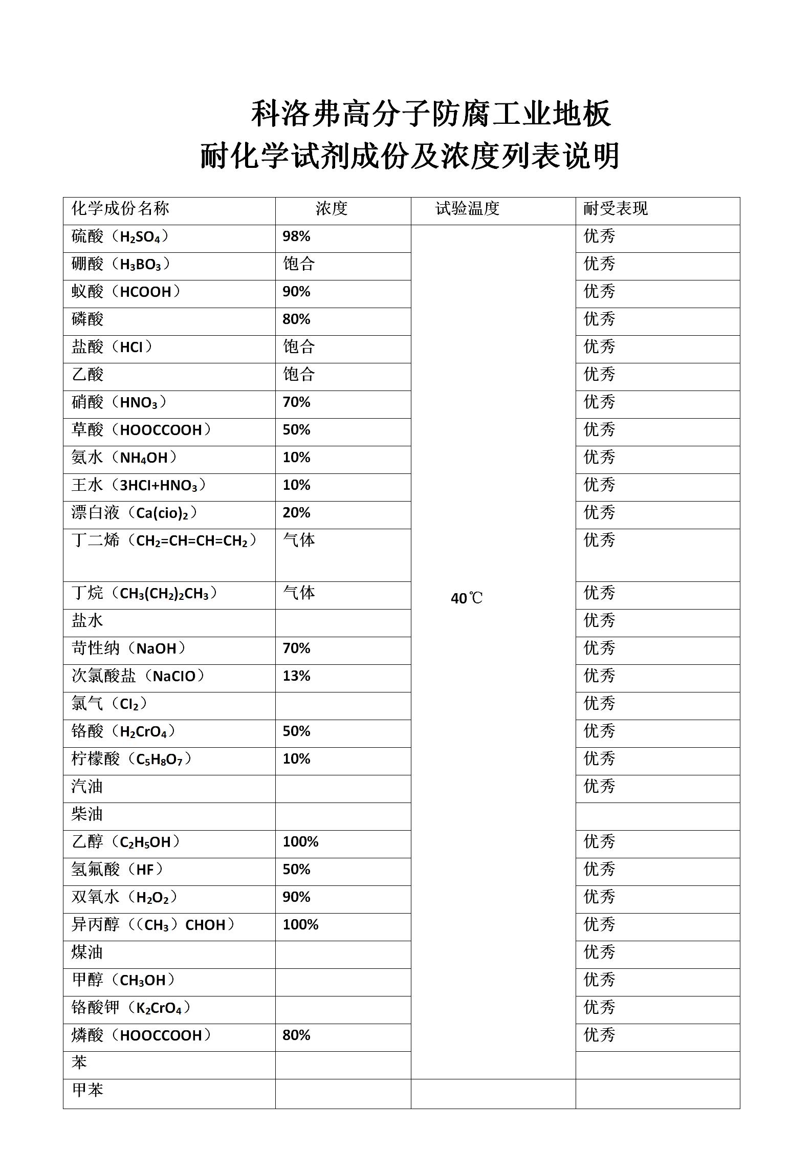 科洛弗高分子防腐工業(yè)地板可耐受的各種化學(xué)試劑濃度: